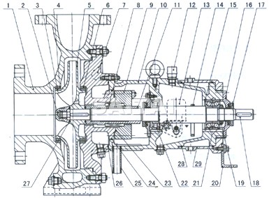 | 1 | 泵體 | 5 | 葉輪 | 9 | 密封蓋 | 13 | 衡位油杯 | 17 | 防塵圈 | 21 | 軸承 | 25 | 排液管 | 29 | 冷卻水套 |