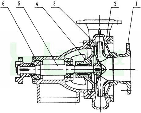 PWF型耐腐蝕污水泵的結(jié)構(gòu)如圖所示,它主要由泵蓋(1)、泵殼(2)、葉輪(3)、軸封(4)、軸(5)和托架(6)等零部件組成。軸封采用新穎的雙端面機械密封結(jié)構(gòu)型式。泵與電動機安裝在共同底盤上,通過彈性聯(lián)軸器由電動機直接驅(qū)動。從電動方向看泵,泵應(yīng)為順時針方向旋轉(zhuǎn)。