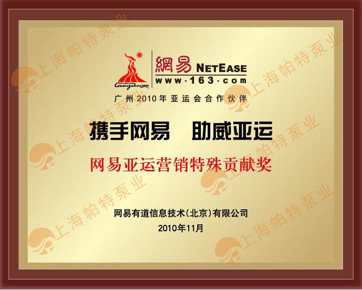 【上海帕特泵業(yè)制造有限公司】榮獲網(wǎng)易首批“攜手網(wǎng)易、助威亞運”營銷榮譽企業(yè)稱號;并獲得“網(wǎng)易亞運營銷特殊貢獻獎”!