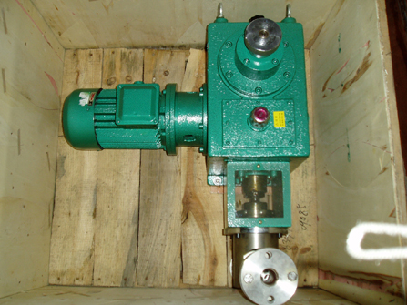 電機(jī)經(jīng)聯(lián)軸器帶動(dòng)蝸桿并通過蝸輪減速使主軸和偏心輪作回轉(zhuǎn)運(yùn)動(dòng),由偏心輪帶動(dòng)挺桿在導(dǎo)筒內(nèi)作往復(fù)運(yùn)動(dòng)。連同柱塞,通過單向閥的作用使泵腔內(nèi)逐漸形成真空,吸入閥打開,吸入液體;當(dāng)柱塞向前死點(diǎn)移動(dòng)時(shí),此時(shí)吸入閥關(guān)閉,排出閥打開,液體在膜片的推動(dòng)下排出。在泵通過調(diào)節(jié)一定的行程的往復(fù)順還工作形成連續(xù)有壓力、定量的排放液體。