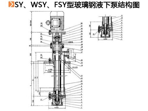 SY、WSY、FSY型玻璃鋼液下泵。WSY型泵為立式玻璃鋼液下旋渦泵、FSY型泵為立式玻璃鋼液下離心泵。該泵因伸入貯罐、只要液體高于泵泵體,既可不灌液而起運送液,平蓋板下設(shè)有泄漏孔。液體不會向貯罐外泄漏。