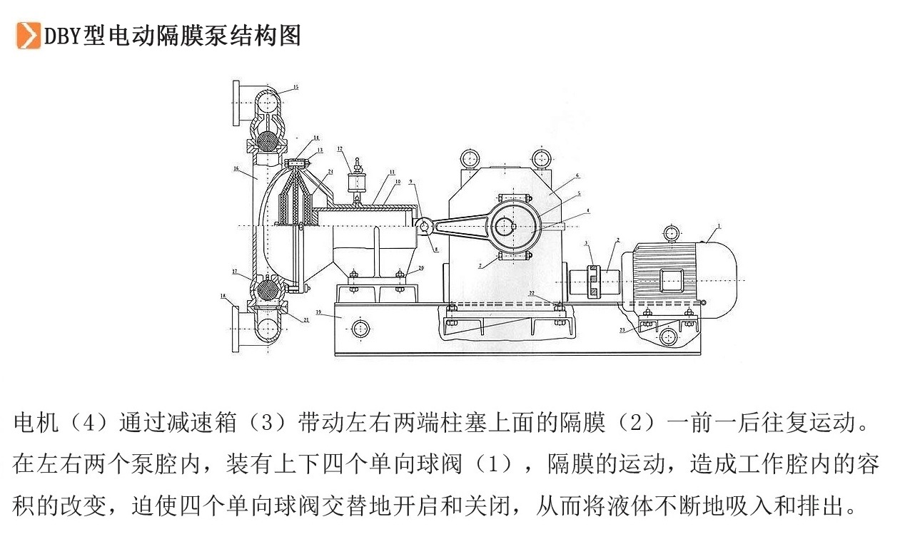 電機(jī)通過(guò)減速箱帶動(dòng)左右兩端柱塞上面的隔膜一前一后往復(fù)運(yùn)動(dòng)。在左右兩個(gè)泵腔內(nèi),裝有上下四個(gè)單向球閥,隔膜的運(yùn)動(dòng),造成工程腔內(nèi)的容積的改變,迫使四個(gè)單向球閥交替地開(kāi)啟和關(guān)閉,從而將液體不斷地吸入和排出。